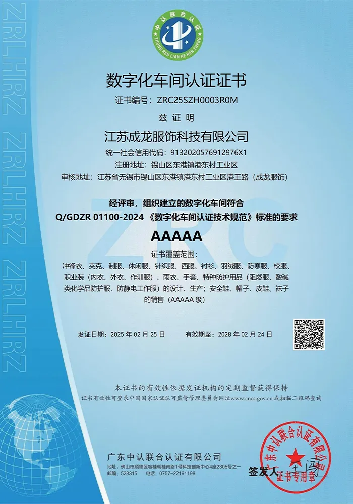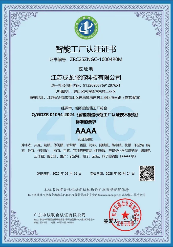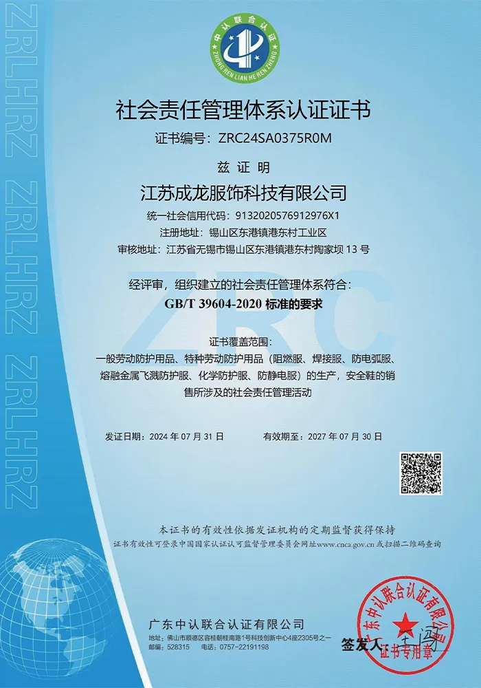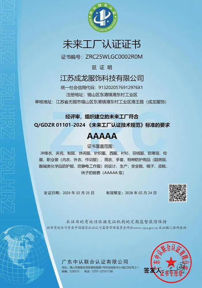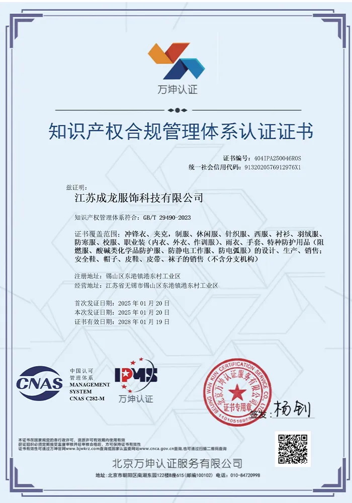 ООО «Цзянсу Чэнлун Технологии Одежды» расположено в городской агломерации дельты реки Янцзы (Уси), недалеко от Шанхая и Сучжоу. Компания уже 30 лет профессионально занимается углублённой разработкой и развитием в области средств индивидуальной защиты. Она является национальным высокотехнологичным предприятием и провинциальным высокоспециализированным инновационным предприятием, специализирующимся в основном на профессиональной рабочей одежде и специальной защитной одежде. Основными клиентами компании являются 99 крупных государственных и центральных государственных предприятий Китая. Компания делает упор на технологические инновации. На данный момент она получила 16 национальных изобретательских патентов, 53 патента на полезные модели, 10 патентов на промышленные образцы и 1 международный патент по процедуре РСТ. Компания участвовала в разработке и пересмотре более 10 обязательных национальных стандартов в области средств индивидуальной защиты, касающихся таких отраслей, как строительство, автомобилестроение, метрополитен, металлургия и других.