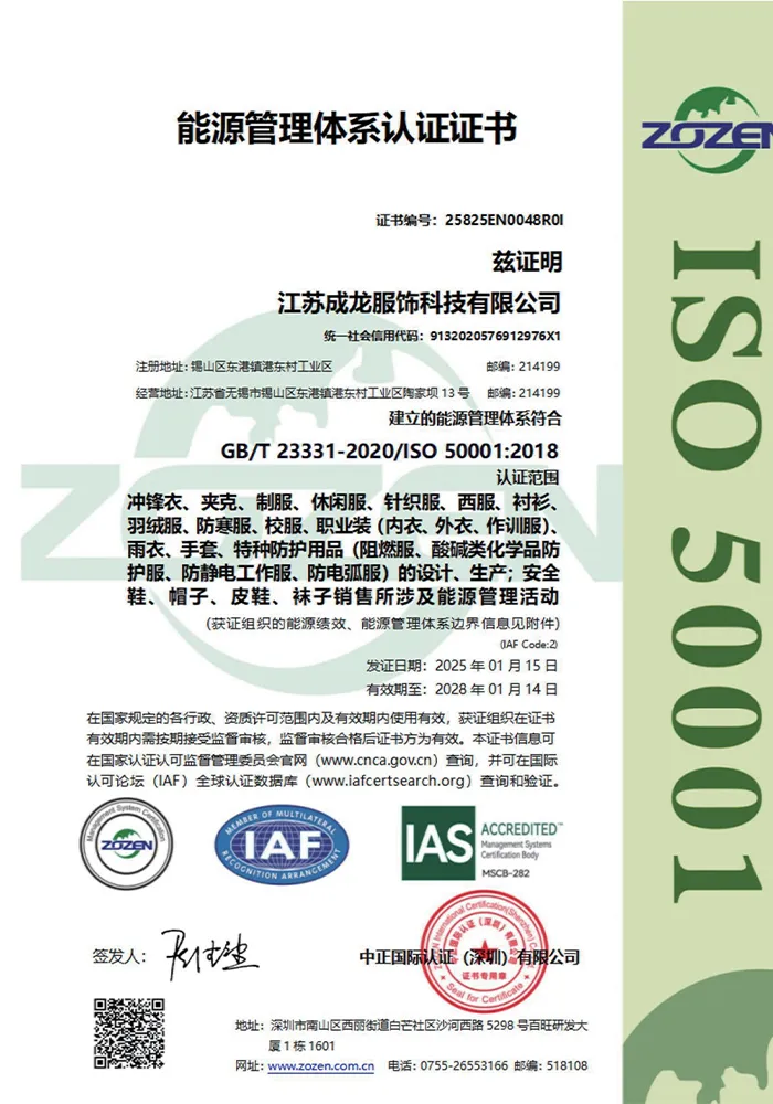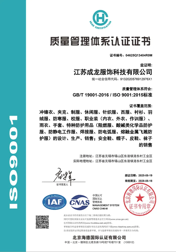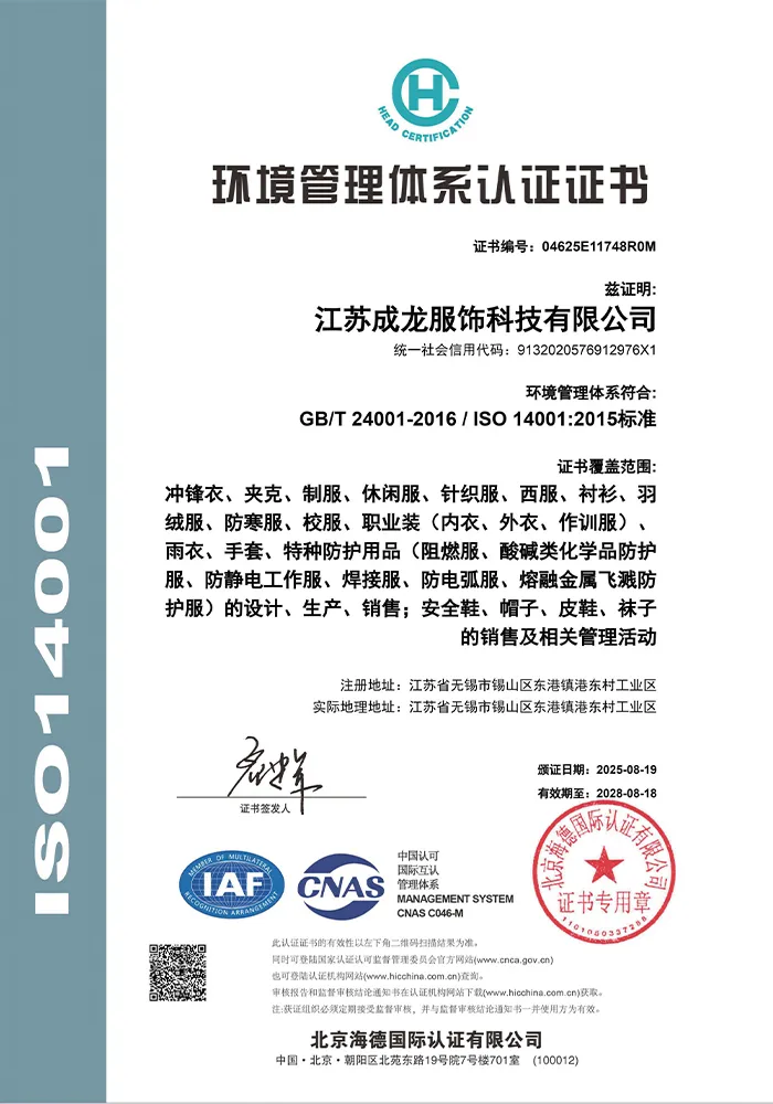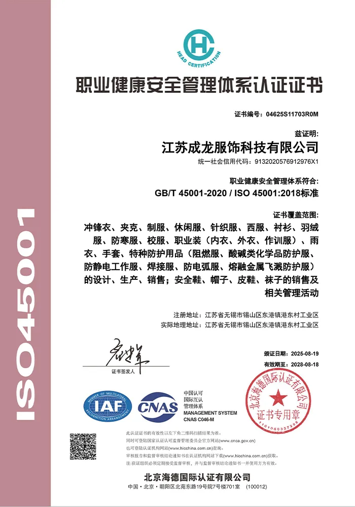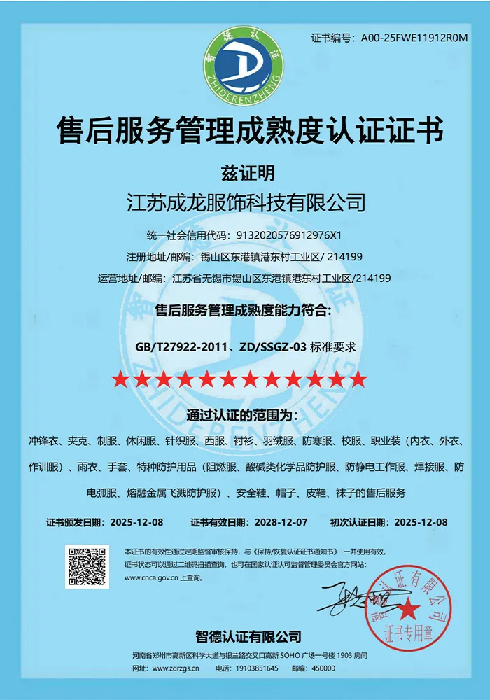 ООО «Цзянсу Чэнлун Технологии Одежды» расположено в городской агломерации дельты реки Янцзы (Уси), недалеко от Шанхая и Сучжоу. Компания уже 30 лет профессионально занимается углублённой разработкой и развитием в области средств индивидуальной защиты. Она является национальным высокотехнологичным предприятием и провинциальным высокоспециализированным инновационным предприятием, специализирующимся в основном на профессиональной рабочей одежде и специальной защитной одежде. Основными клиентами компании являются 99 крупных государственных и центральных государственных предприятий Китая. Компания делает упор на технологические инновации. На данный момент она получила 16 национальных изобретательских патентов, 53 патента на полезные модели, 10 патентов на промышленные образцы и 1 международный патент по процедуре РСТ. Компания участвовала в разработке и пересмотре более 10 обязательных национальных стандартов в области средств индивидуальной защиты, касающихся таких отраслей, как строительство, автомобилестроение, метрополитен, металлургия и других.